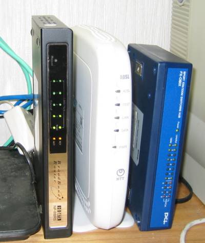 今回用意したのが 真ん中のNTT レンタルADSLモデムと 左のBroadBand Router 。 (I-O DATA NP-BBRS) モデムの格好は昔ながらのNTT御用達。 ルータの後ろにモデムと一緒に送られてきた スプリッターが置き場がなく寄せてある。 (ここから電話機にケーブルが伸びてる) 昔のISDN ターミナルアダプタとよく似た デザインで、Switching HUB とRouterに 挟まれてどうも違和感がある。 スチール製の2つの間に置いたのには わけがあって、HUBの底面に磁石が付いており、 Routerと並べると強力にピタッとくっついてしまう。 磁力の影響がどれだけあるか分からないけど、 ちょっと心配なので離しておくことにした。 HUBの100M 8ポート のうち、6ポートは すでに埋まっており、そのままのNetwork構成で Routerにつなぐ。 |