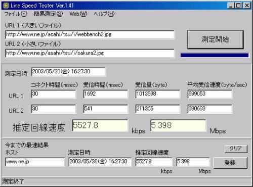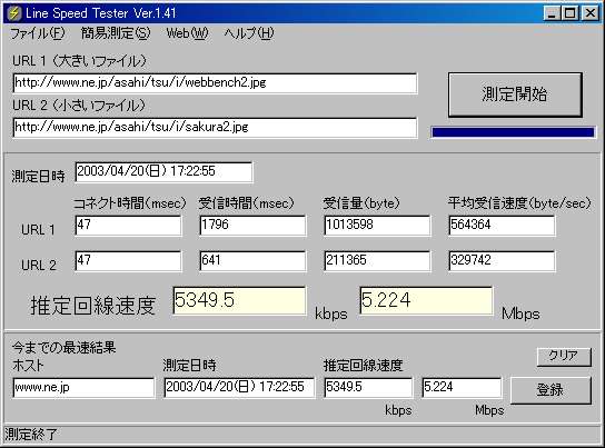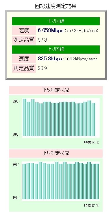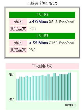 無事につながって、速くてとってもいい気分なのですが、 どの程度の速度が出ているのか知りたがるのが人情というもので、 すぐにベンチのようなことをやって見たがるものです。 推定速度 約5Mbps というスコアは、まぁまぁ納得のいくスコア。 |