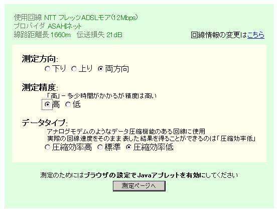 1つだけのテストでは信頼度が低いので、サイト上のTesterでもひとつ速度測定。 線路距離が1660m 伝送損失が21dB といった個別情報も取得できたのは嬉しいおまけ。 (局から1.6Km も離れてるはずないのだけど、ケーブル線路の長さってこんなにあるものかなぁ...) 測定は下のようなオプションでやってみた。 |