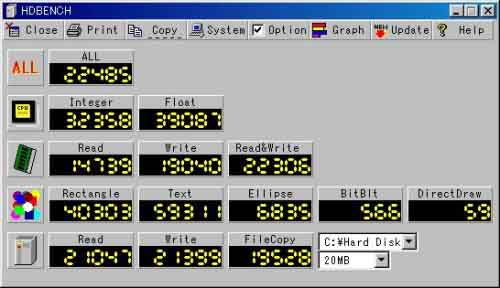 Processor AMD Athlon 549.86MHz[AuthenticAMD family 6 model 1 step 2] ALL Integer Float MemoryR MemoryW MemoryRW DirectDraw 20309 22240 26863 12212 17708 24462 75 Rectangle Text Ellipse BitBlt Read Write Copy Drive 38315 53578 5019 566 19710 21355 19516 C:¥20MB |