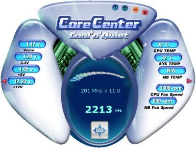 MSI のおまけソフトの代表がこのCoreCenter(左)なのだと思う。システムの温度表示を知りたい時に役立つだけでなく、左側のVoltageCoreなど多少は弄れる。