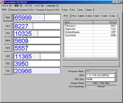 右のCrystalMarkは時々動作させたことはあるけど、画面的にはあまり面白くはない。しかし、結果表示のタブを見ると、かなりいろいろな部分のシステム状態が分かるようで案外いいのかも知れない。スコアは前のものを保ってないので何ともいえない。