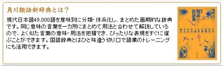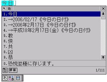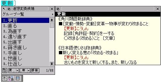 | 「End」と「Ctrl+Tab」で、前に導入してある連想変換辞書とも相互に一発で切り替えできるので、ちょっと調べたい言葉などに遭遇したときなど、ワープロ打ちながらそのまま解説を呼び出せて便利。勿論、仕事途中で解説文を読み始めてしまったら能率はぐんと下がって逆効果。 そこは、とりあえずコピーでもしておいて、文書などに厚みをもたせるツールといった位置づけにしておくのがいいのかも。 |