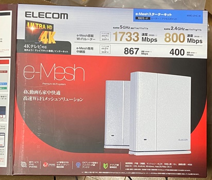 ELECOM WMC-2HC-W という e-MeshのWi-Fi ルーターと中継器。メッシュネットワークの設定を簡単に行なえるというのは、e-Mesh 機能の一つでもあるようで、設定・設置は簡単にできて楽ちん。 おんなじ形状のが2つ。 中継器を壁掛けにするのにちょっと手間がかかったぐらい。 今は、アンテナが4本立ってくれてるけど、環境改善となるか..?! |