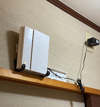 | 中継機の取付は親機と子機のほぼ中間(やや子機寄り)にあたる廊下の天井近くの壁にぶら下げ。(右) ま、コンセントがそこにあったのでここに決定。(^^ゞ 東側のお部屋でもWi-Fi 3本マークで使えるようになりました。 |