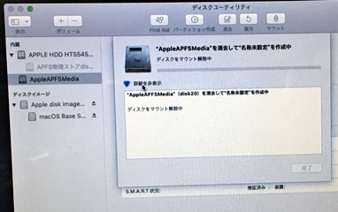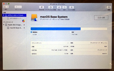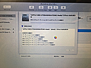 電源→option+command+R の長押し...で、今度はリンゴマークでなく地球のマークが出てくる。 ディスクユーティリティを選択して、待つ。 延々...、HDDへのアクセスにやたらと時間がかかる。 |