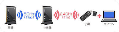 中継機を挟むイメージは下の図のようで、親機-中継機間を5GHz帯、中継機-子機間を2.4GHz帯と異なる周波数帯で中継できるため、高速Wi-Fi通信が可能...なんですと。 |
