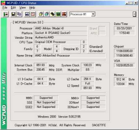 Socket-Athlonでもとりあえず700@850 がとおった。 (Iwill のKV200-RでもBIOS可変にしてくれてたら、そのまま使ってたのに..) |