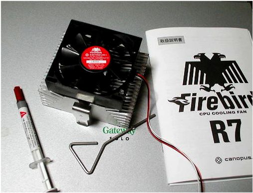 CPUクーラー、 これの話題が賑やかになる季節が近づいてはいるが、 CanopusのFirebird R7 、近頃評判のヤツを試してみる。 信越化学のシリコングリスと、取付金具、 それになんとマニュアルまで付いてきた。 専用の取付金具は役立つ。 |