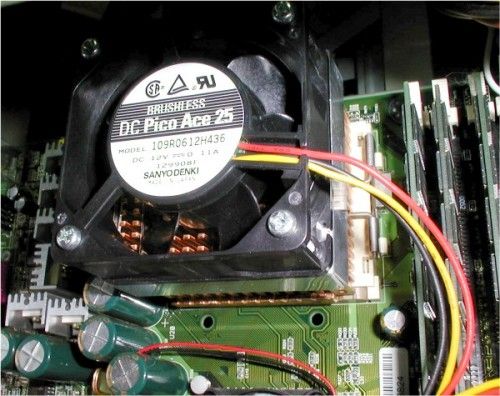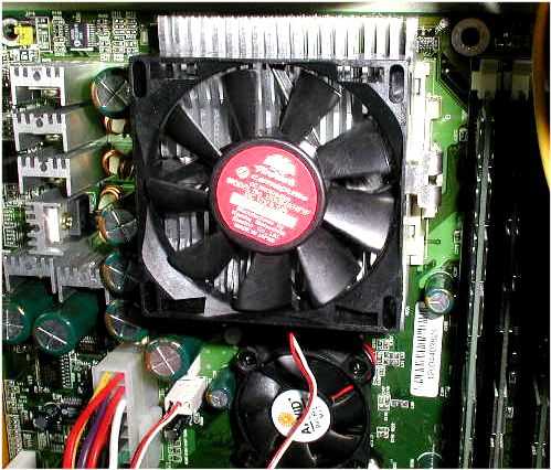 ヒートシンクの形状が火の鳥なんでしょうね。 ファンはCanopusのこれ専用オリジナルのようで、 流体軸受けのDC12V-0.19A...4000〜4500回転仕様。 2GHz まで大丈夫...なんて書いてあった。(^^;; ちなみにファンの風向きはCPUに吹きつけタイプ。 |