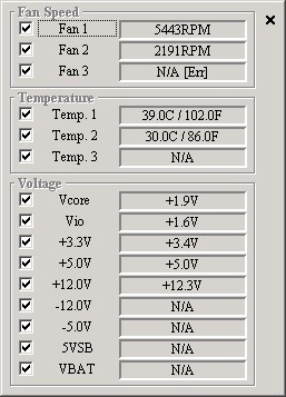 LM78monで温度測定したところ、 M/Bとの温度差が +10℃ と喧しかったHedgehog-238Mと ほぼ同等。ただ、回転数は7000回転などないはずなので、 Canopusファンのセンサーが正しく認識されていない模様。 騒音は改造238Mよりも静か(...というか、うるさくない)。 |