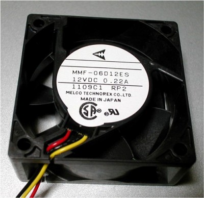製品に付いていたファン。MELCO製だったのを発見。 ギガAthlonの熱対策として、 回転数は高い(12V--0.22A)のだが 騒音はなかなか半端ではない。(^^;; |