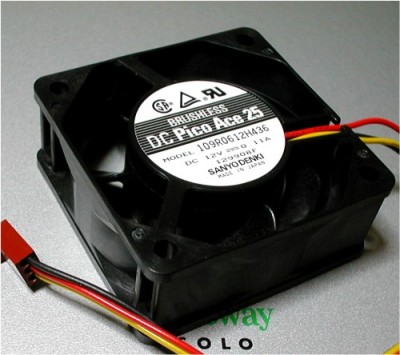 騒音: 28db という三洋製のケースファン。 回転数3800rpmという表示で、6センチファンでもあるし、 これならCPUファンとしても使用できるんでは...とゲット。 12V--0.11A の表示がかすかに見える。 |