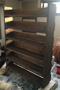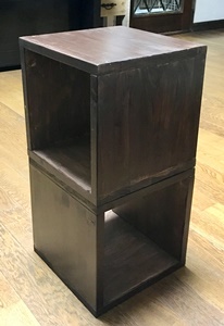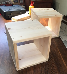 本格的な本棚製作にはまだ届かないが、まずは第1歩。リビングに重ねておくと、ソファの傍でコーヒー飲むのに役立ってる。案外きれいにできて気に入ってる。ど素人工芸、やれるかも。 |