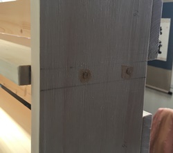 ほぞを組むテクはまだ?ないので、脚内側の寸法を測り直して短くした補強板をぐりぐり差し込み、外側からビス止めする。長い方はビスの斜め打ちで固定させる。(前のビス穴の傷跡はパテとペンキで隠す。)