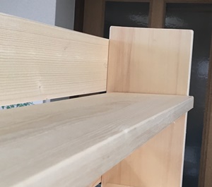 ほんとは150mm幅の板が欲しかったが見つからず、140mmを手前に10mmほど出っ張らせて棚に余裕を持たせる。