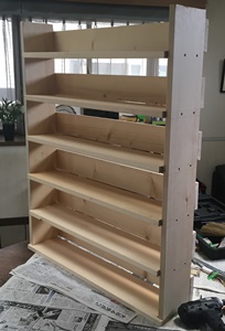 工夫したのが棚板の手前側を上げて微妙に傾斜を付けたところ。