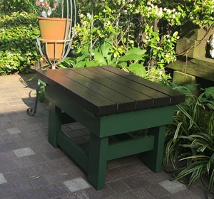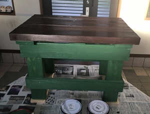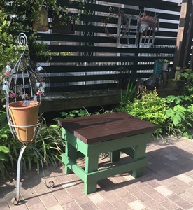 天板をパーゴラと同じ茶系で、脚その他全体を奥さんお勧めのグリーンでペイント。