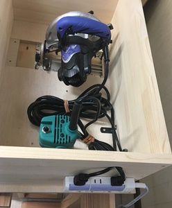 悩んでたのが、テーブルソーの格納スペース。棚板を100cmとることで、一番下に置き台テーブルごと入れられるように作ってみた。
