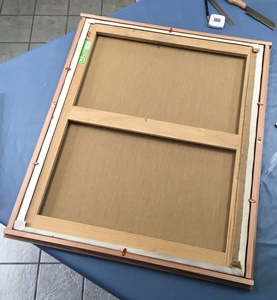 キャンバスの厚み分を溝掘りでは埋められずに、溝にはまった裏側に角材ブロックを作ってキャンバス厚み分の水平とれるまで収めるしかなかった。