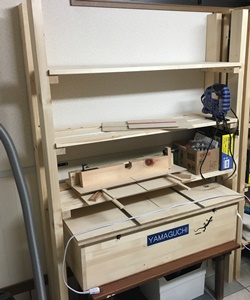 テーブルソー、作業音がぐっと静か(キィ〜ンがクゥ〜ン)になった。また、オガ粉が殆どハコの中に収まって掃除が楽。しかし、なかなか道具の存在感がある。
