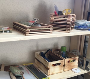 右上は、端材をテーブルソーで薄く縦切りして遊びで作ったトレーと文房具ボックス。トレーには額縁製作に使うトンボや吊りカン、ヒンジやフックなどの待機パーツを収納。