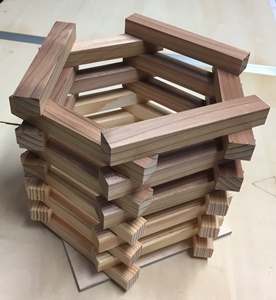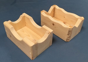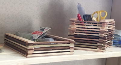 これら3つの小物は、余り材と端材を利用して遊んだもの。テーブルソーだと端材などミリ単位でも縦切りできるので、積み木遊びのようなこんな入れ物ができた。
