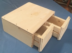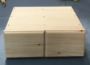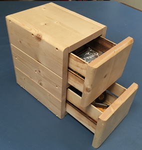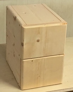 左の完成写真を眺めると、なんだか分からない。正体不明が面白いと思い、あえて前面に把手は付けない。内側のハコは百均で見つけてとっておいた木箱。側板の中程が中空になっていて、桟木を咬ませるのにちょうどいいと思ったが、隙間が多くカタカタがひどいので桟木を底面角に付けて収めた。窮屈になったのの調整で手間取ったが、まぁ使える抽斗にはなった。