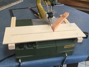 フッと思いついてやってみたのが、電動糸鋸の横切り直線カット治具。