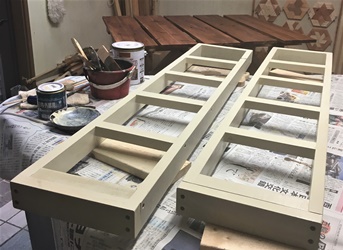 磨いてもなかなかきれいにならなかったヒノキの古材、アイボリー色で厚化粧させて磨く。(^^ゞ