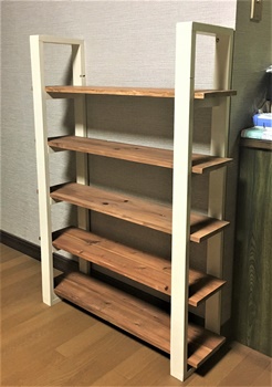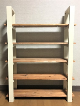 棚の安定を考えて、下と4段目だけを棚受けにビス止めし、あとの3枚は渡しただけ。