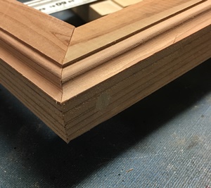 約15mm幅でそろえた杉と1×4材を、4枚ずつ並べて45°カットしたものを組み合わせ、一辺約26cmの正方形にまとめてみたのがこれ。