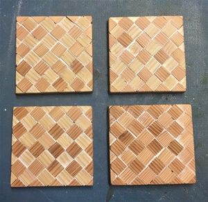 今回のデザインボードでやってみた"線の交差"を、余り&端材で鍋敷きなどの模様にしてみた。