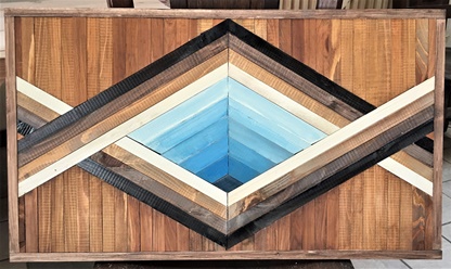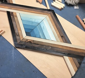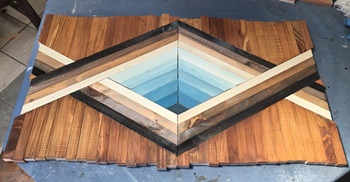 15mm厚の杉板を20mm幅で組み合わせ、内側のグラデーション部分だけが30mm幅で、すべて60°カット。