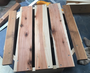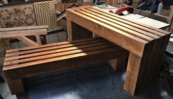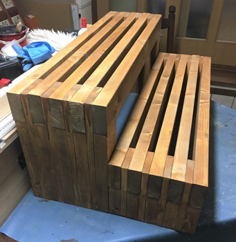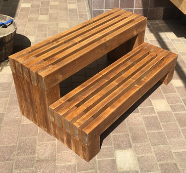 前に作った重ね板ベンチ、もらわれて大事にされているのを見て、家にも1つ作っておこうと始めた。