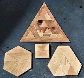 台形や三角形などのデザイン板パーツの残ってたのや、廃材・端材再活用で上のハコでも使った汚れた棒など、あれこれいじって磨きをかけると結構見栄えのする板ができるものです。