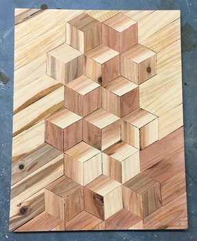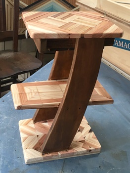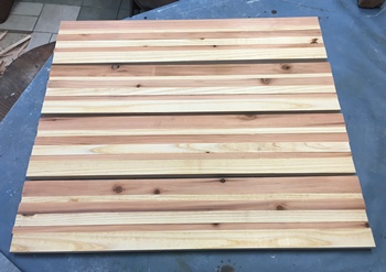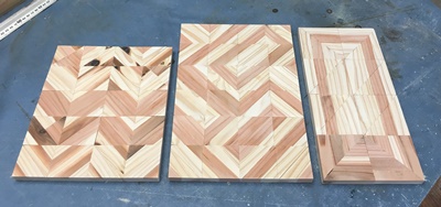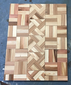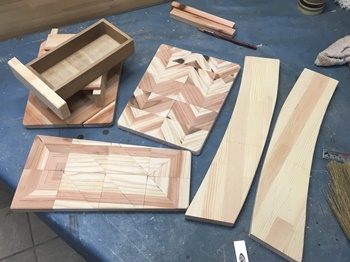 何かの素材に使えないかなと、幾つか材の色味で模様のある板を作ってみた。 |