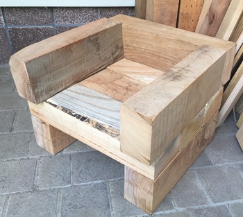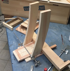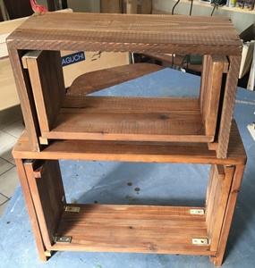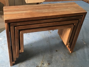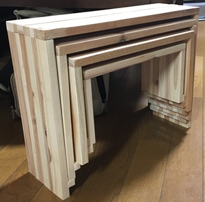 構造のアイディアは面白いけど、作業は単純。 ただ、15mm厚、12.5cm巾の貼り合わせ杉板なので、歪みがあったり面が凸凹してたりと、直角出すのに案外骨折れた。 とりあえず、四重の入れ子にしてみた。 |