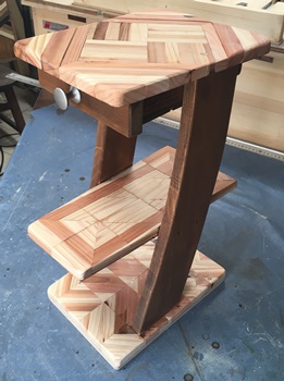 右上の図に、ハタ金でもぅ一本押さえて裏側からのビス打ち成功。 形成、ほぼ完了。(左) 中板は裏側に補強板を足し、底板は安定を増すのに合板で厚みを加える。(右) 脚の高さ約40cm、アクセントに天板下側に小引き出しを付ける。 |