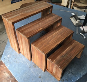ま、入れ子なだけに格納はコンパクトに1つにまとまることと、組合せと並べ方ではいろんな使い方もできるのかも知れない。 さて、何を乗せようかナ...(?_?) |