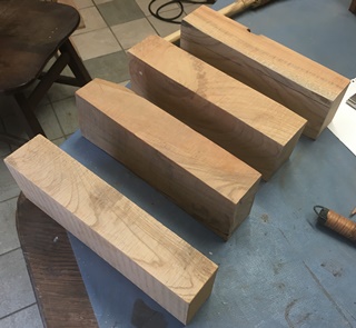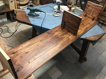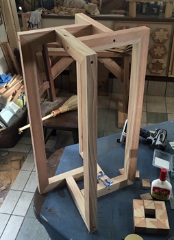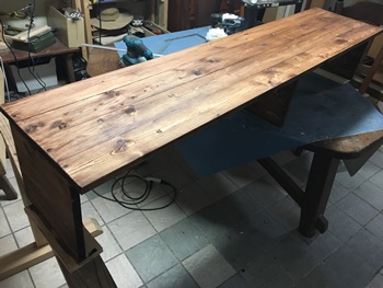 コの字形で、横24.5cm*2、縦68cmを4つ。 額づくりで使った材でもあり、そのときと同様に45°接ぎ合わせにビス打ち。 埋木してそこそこ磨いて、このままでも何か乗せて使うこともできそうだけれど、やはり天板を乗せることにする。 |
