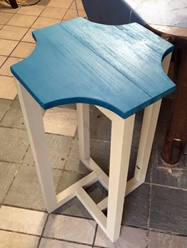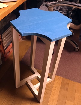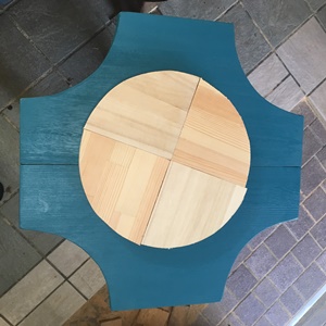 天板は、19mm厚の集成材を2枚接ぎ合わせる。 1辺40cmの天板、角を丸めようと思ったけど面白味に欠けるので、逆に扇形に四隅をカットしてみた。 わりといい感じ。(^o^) ただ、天板の色をブルーで塗って、明るくは仕上がったけど、ウォルナットかオークでやった方が良かった気もしてます。(*_*) |