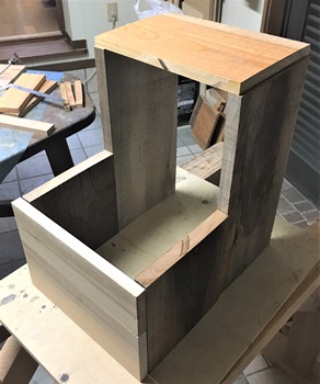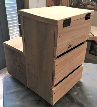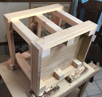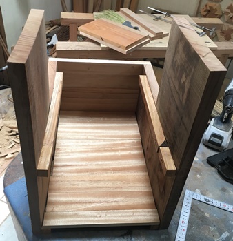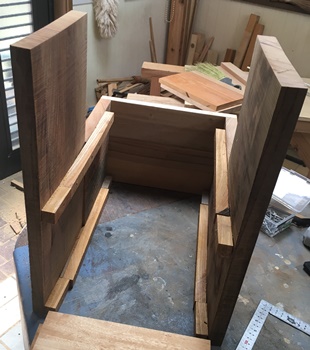 縦の負荷に対して頑丈にするため、約2.5cm厚のケヤキ材で側板を組む。天板は1つだけケヤキで用意出来たけど、蝶番で開閉させるのにはちょっと重たい。
