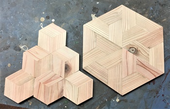 4cm巾で縦引きした15mm厚の杉板、1辺4.5cmのひし形と3辺が4.5cmの等脚台形をパーツに、色合いも模様も気にせずに並べて組合わせてみたモノ。