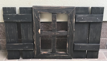 黒(+ウォルナット)のウィンドウ両側に、同じ高さで板きれを並べてみる。並べて板塀などにかけると、ちょっと広がりが感じられて面白いかも。すごく簡単...。