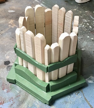 (右は)六角形リングを底面だけにしてクイをでたらめに並べたイメージの小物入れ。
