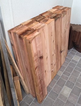 この日は大当たりで、38mm厚、14cm巾、78.5cm長のきれいにカットした杉板が大量に山積みされてるのを発見 !!
