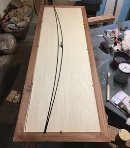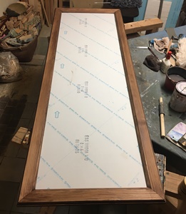 材は24mm厚 60mm幅のエゾ松、6フィートものを3本。 横161.5cm 縦57cm の額縁。 表面の塩ビ板と裏押さえのベニヤもサブロク(91cm*182cm)が必要で、これはクルマに乗せるのが大変。 |
