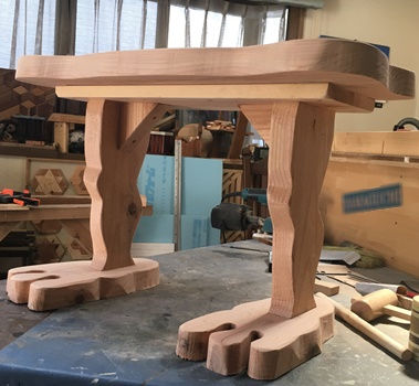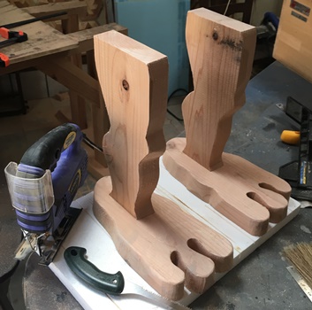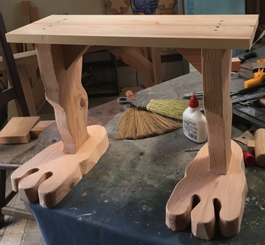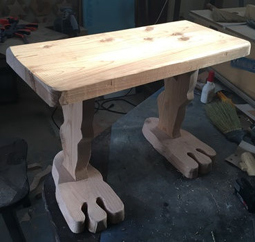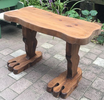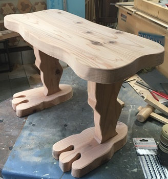 成形ほぼ完了の後でどうかなとも思ったけど、天板に曲線カットのアクセントを付けてみました。(上左 上右) ちなみに足は30cmカットしたのを曲線切り落とし。 デカ足でしっかりと地面をつかんで? くれてます。 足と脚のイメージが「ゲゲゲの鬼太郎」っぽいので、ちょっと笑える庭の腰掛け(or テーブル or 鉢置き...高さ約40cm)に。 |