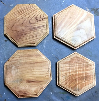 | もともとが、「フライパンを直接置ける鍋敷きが...」の声でやってみたもので、ケヤキの堅さと厚みのある材ならしっかり置けるんじゃないかと。 ついでに30mm厚のも3枚。どれもつるつるに磨いただけ。 堅くて重量感あってなかなかいいんじゃないかと思います。 |